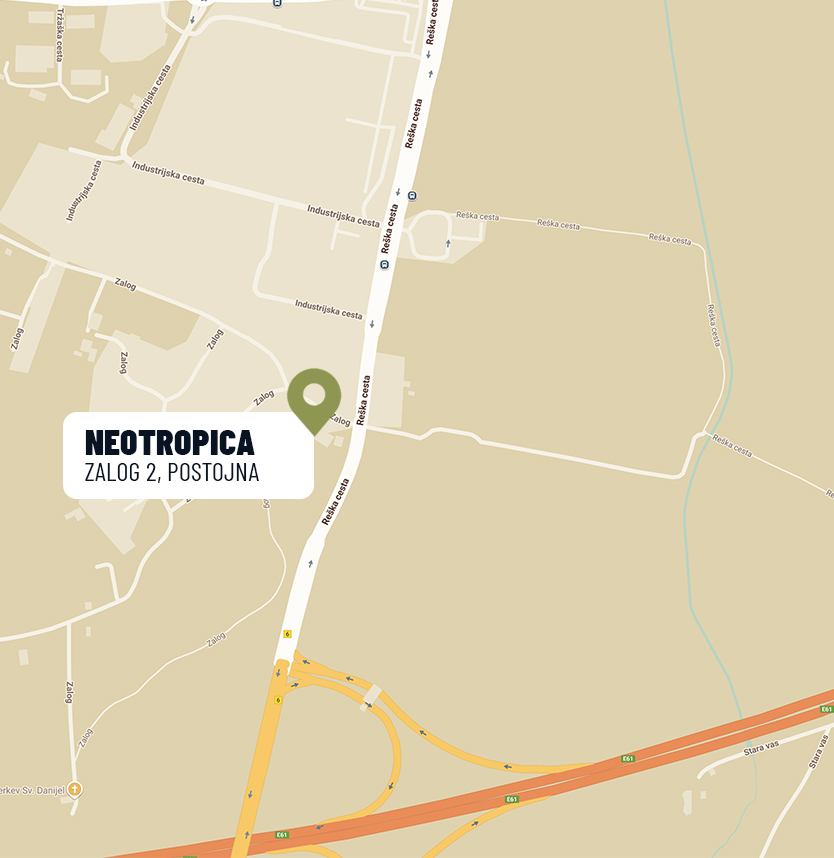 Najdete nas na naslovu Zalog 2, 6230 Postojna. Če prihajate iz smeri avtoceste, nas boste našli kot *prvo hišo na levi pred vstopom v Postojno. Preprosto sledite glavni cesti in težko nas boste zgrešili. Parkiranje je omogočeno na parkirišču stavbe Hop House, kjer se nahaja tudi Neotropica.